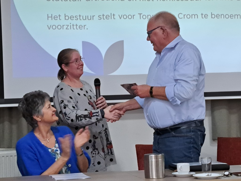 9.4 Het bestuur heeft Tonnie de Crom bereid gevonden de voorzitterstaak over te nemen. Zij heeft al vanaf mei 2025, als aspirant-bestuurslid, de bestuursvergaderingen bijgewoond. Het bestuur stelt de vergadering voor mevrouw de Crom te benoemen tot voorzitter. Zij wordt met applaus benoemd en neemt plaats aan de bestuurstafel.
